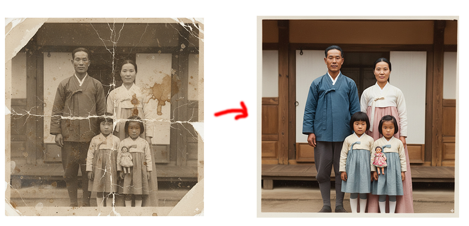낡은 가족사진의 손상 부위를 보정하고 색을 입히되 . 인물의 고유한 인상을 해치지 않도록 미세 조정한다 .